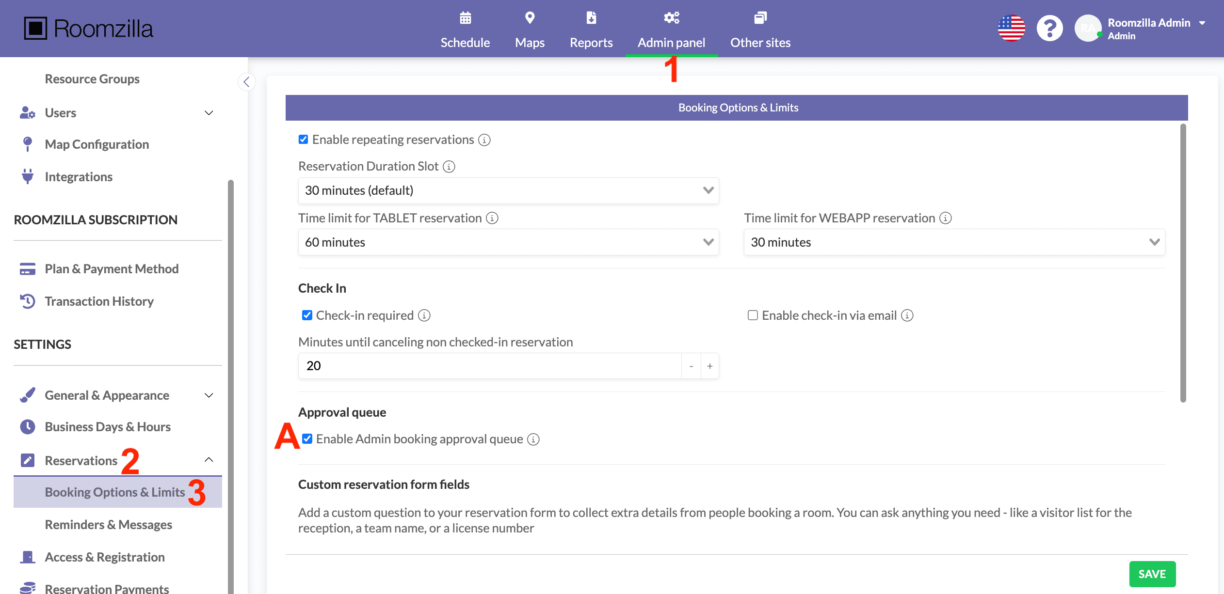 1. まず、管理パネル [1] > 設定: 予約 [2] > 予約オプションと制限 [3] セクションに移動します。