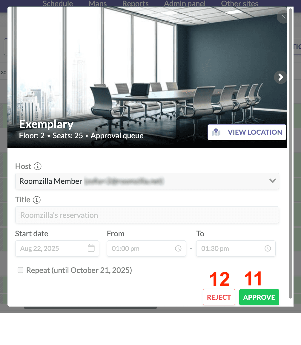あるいは、予約リクエストタイル[F]を直接 クリックすることもできます。これにより詳細ウィンドウが開き、リクエストを承認 [11]または却下 [12]する同じオプションが表示されます。