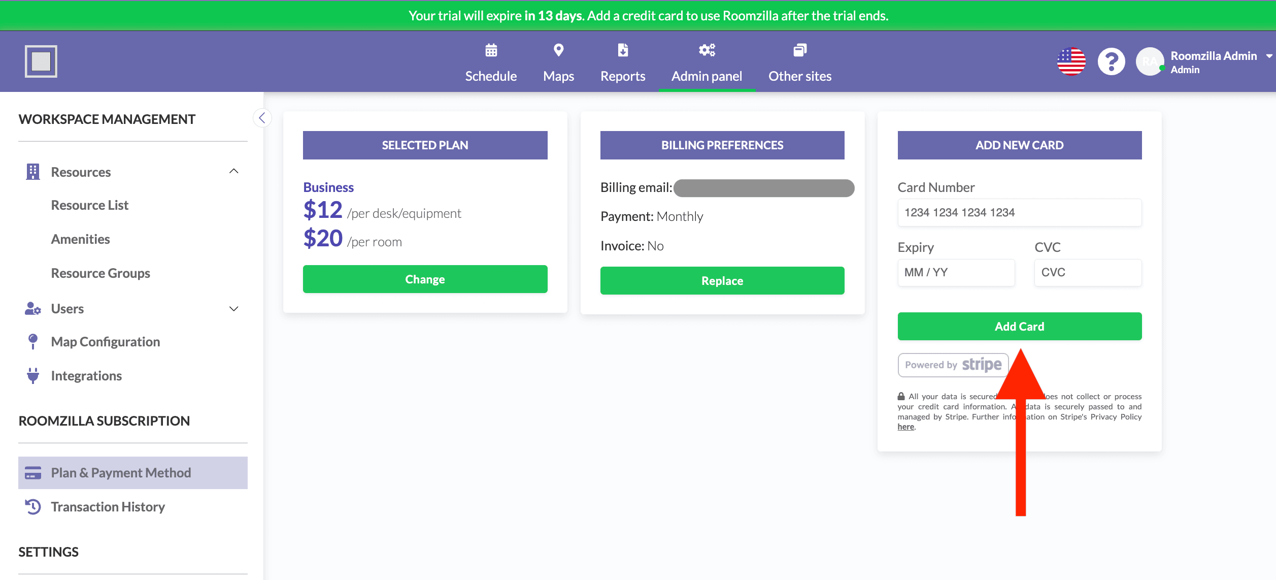 管理パネル > Roomzilla サブスクリプション > プランと支払い方法