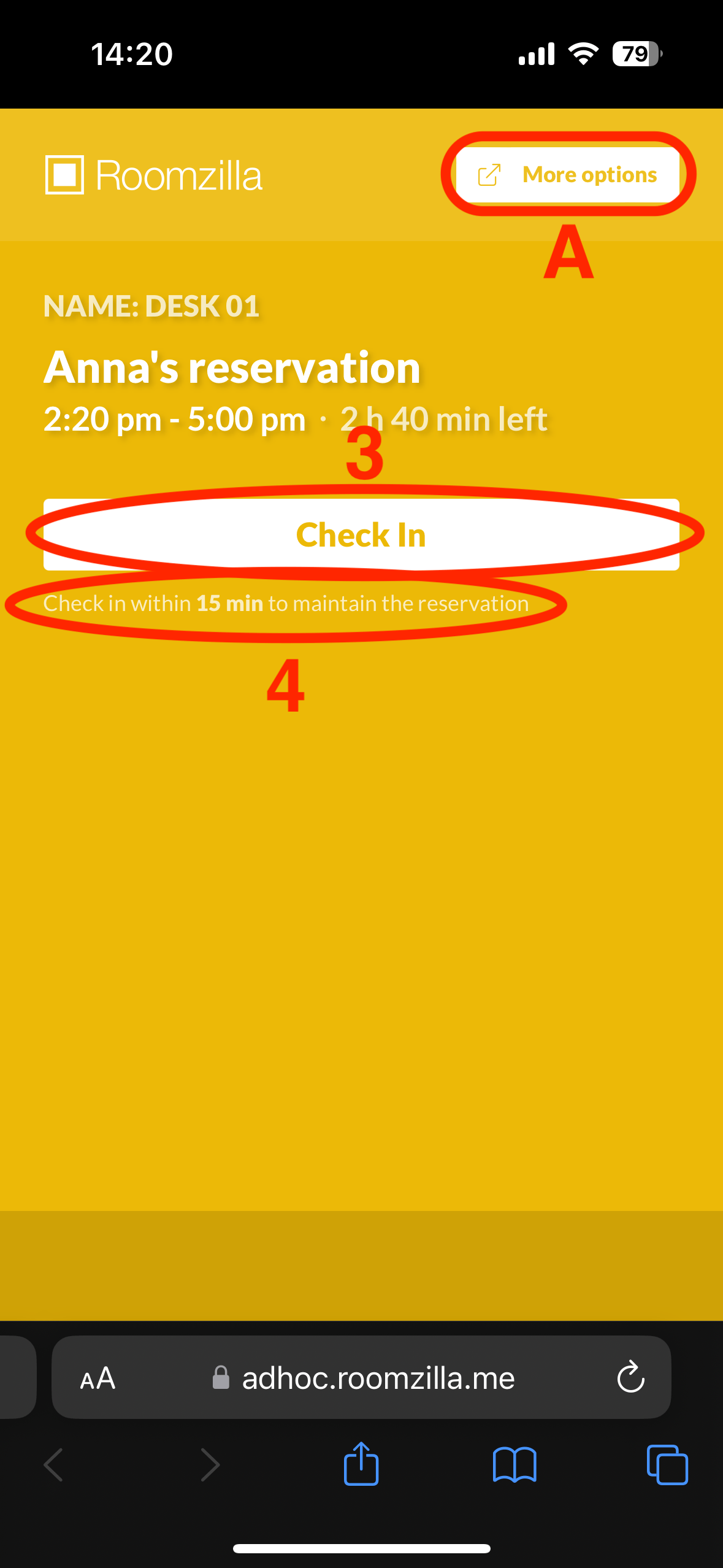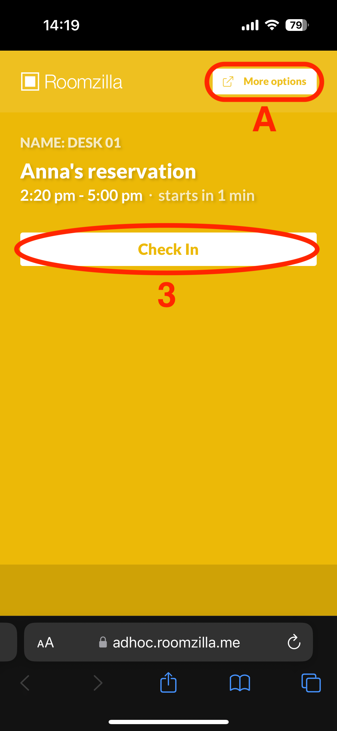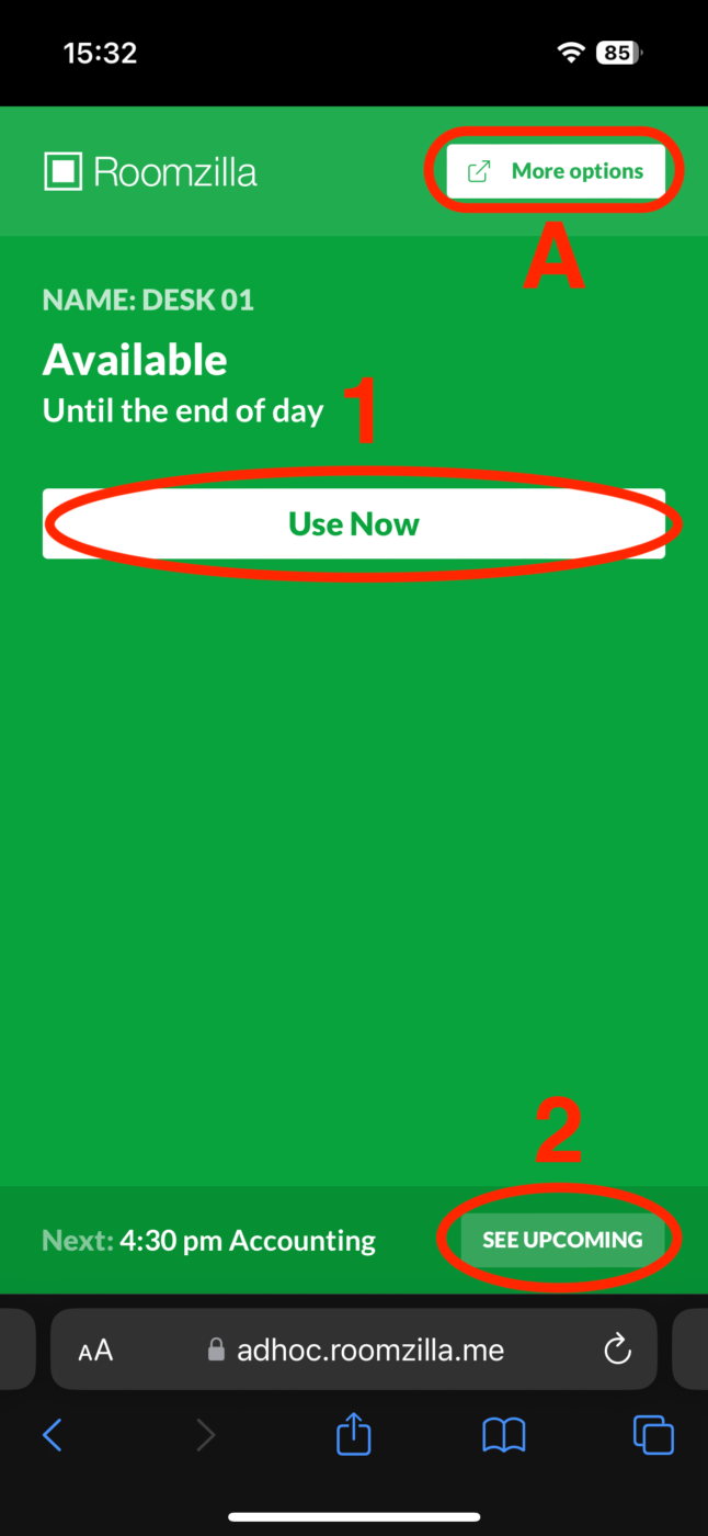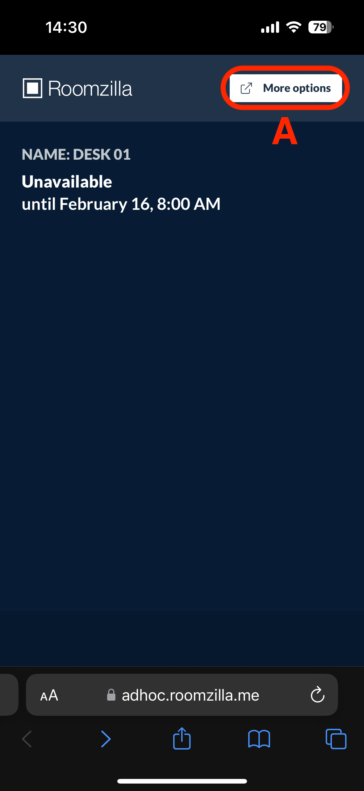 「その他のオプション」ボタン[A]を押して Roomzillaのモバイルバージョンを開き、スペース内の他の予約可能なリソースの可用性を確認したり、スケジュールされた予約を管理したりできます。