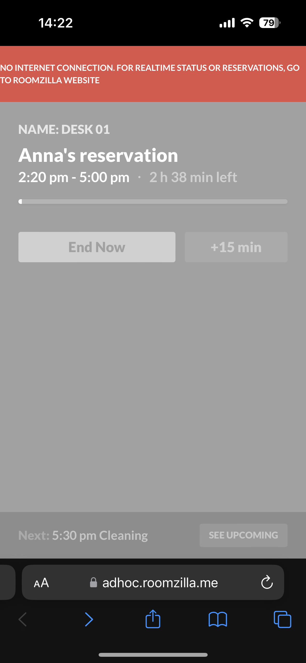 黄色い画面は、チェックイン待ちの予約が入っていることを意味します。その部屋で事前の会議が予定されていない場合、黄色のチェックイン画面は次の予約開始の5分前に表示されます。早めに到着し、「チェックイン」ボタンをタップすると[ ]が表示されます。3をタップすると、すぐに予約が開始されます。