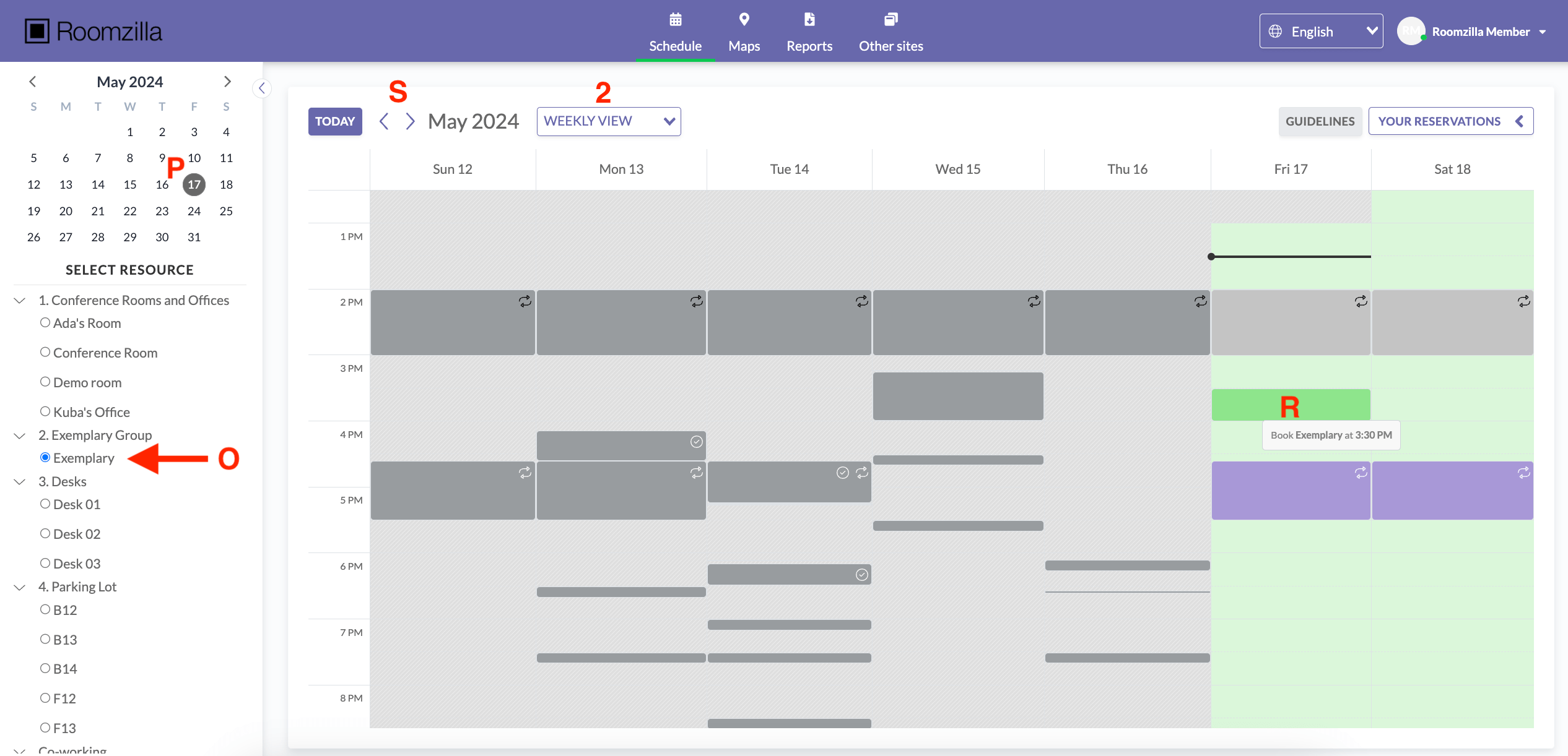 D- グループの折りたたみ- ワンクリックで、予約に興味のないグループ内のリソースをすべて非表示にし、見やすくすることができます。