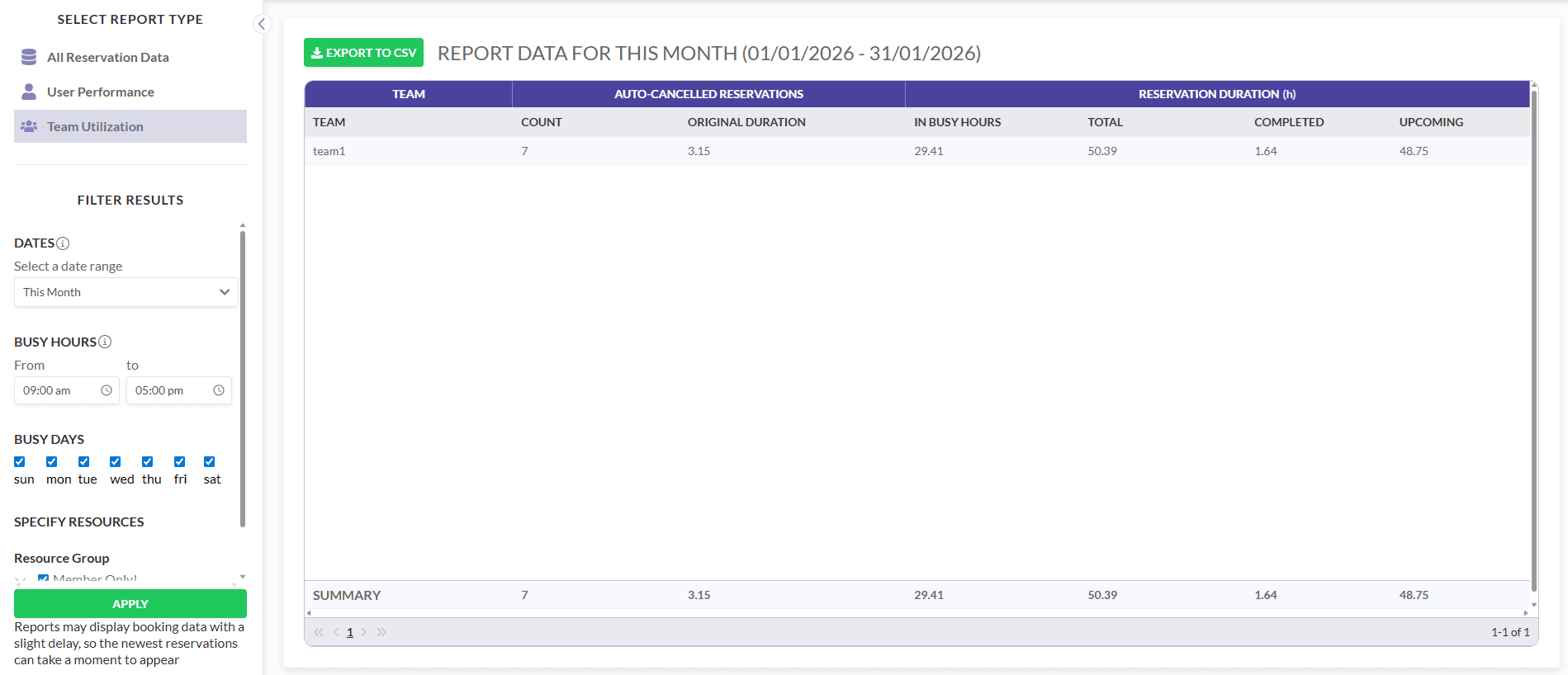 The Team Utilization report provides a comprehensive overview of reservation statistics aggregated by team, helping admins and members understand usage and capacity.