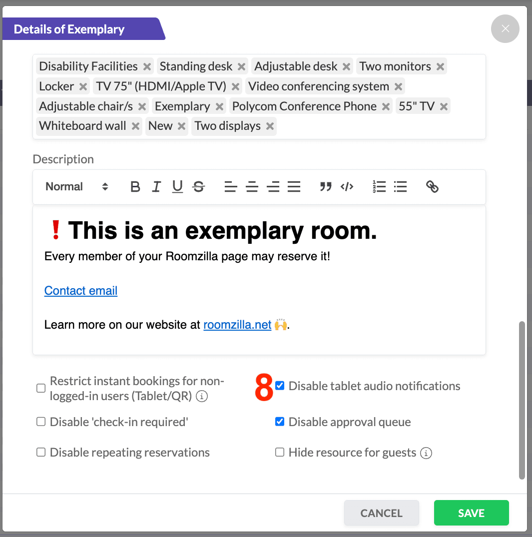 2. In the details window that appears, check the “Disable tablet audio notifications” box [8] and hit “Save”: