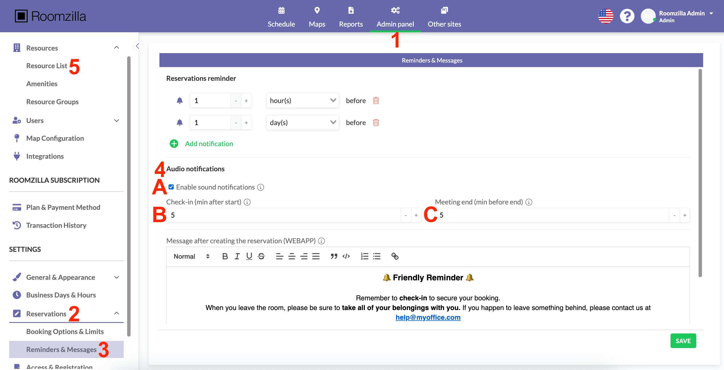 1. Start by heading to the Admin panel [1] > scroll down to Settings: Reservations [2] > Reminders & Messages [3], where you will see options for Audio notifications [4]: