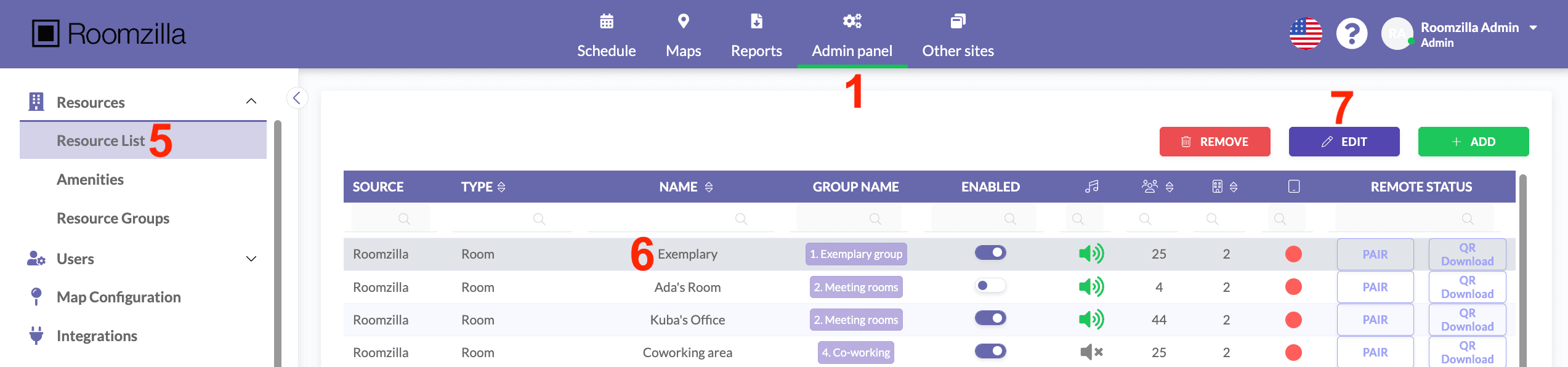 1. Go to: Admin panel [1] > Resource List [5], select the Resource you want to have updated [6], and hit “Edit” [7]: