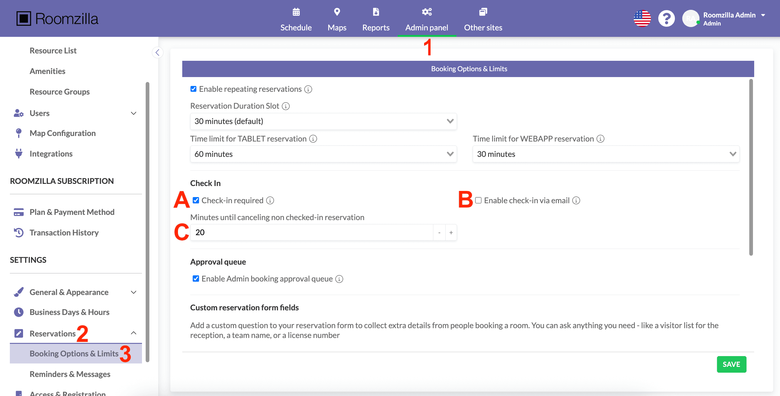 1. To enable the Check-in and Auto-Cancelation feature, go to: Admin panel [1] >  scroll down to Reservations [2] > Booking Options & Limits [3]:
