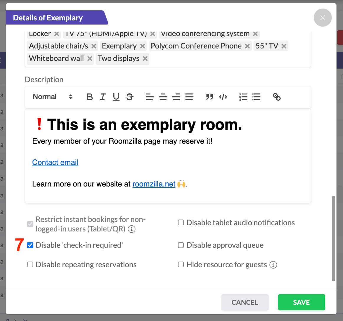 2. In the details window that appears, scroll down to check the “Disable check-in required” box [7] and hit “Save”: