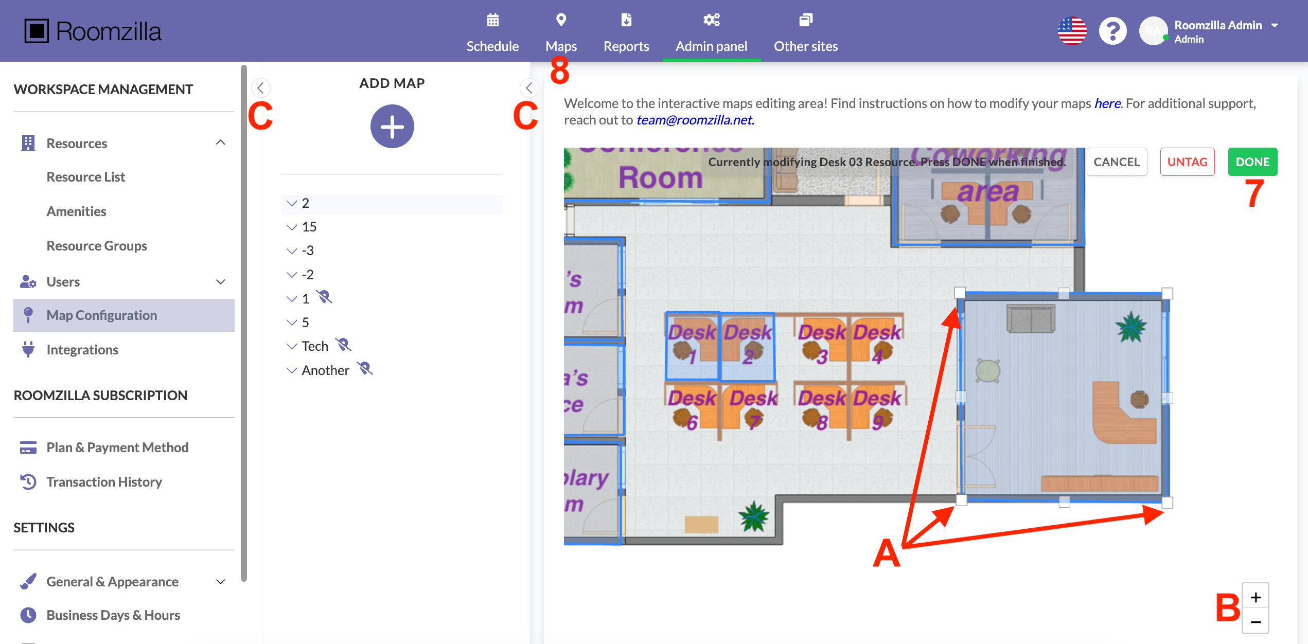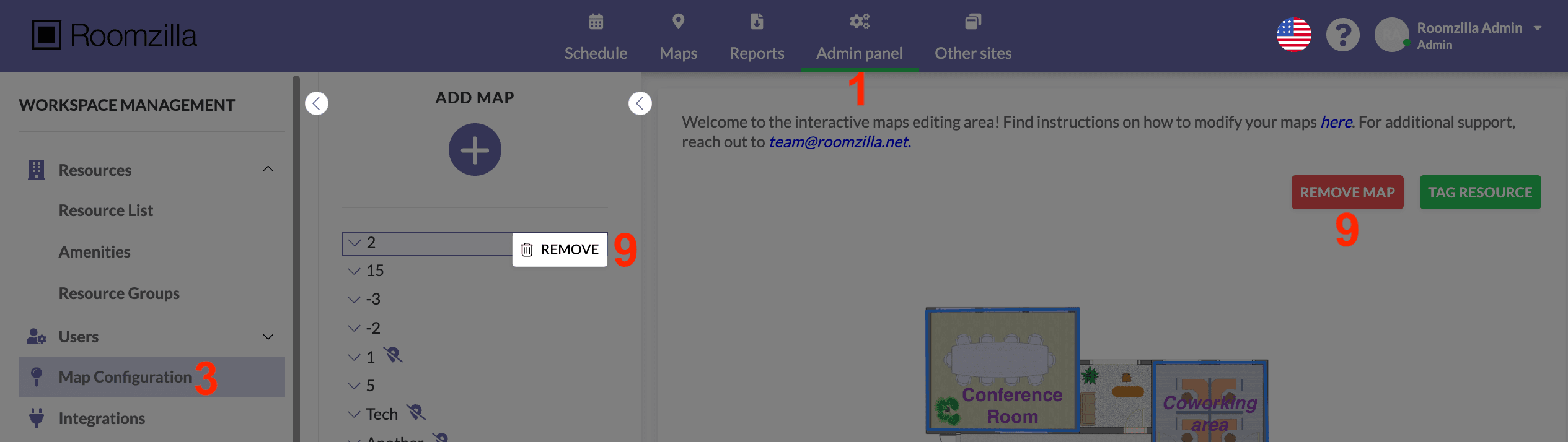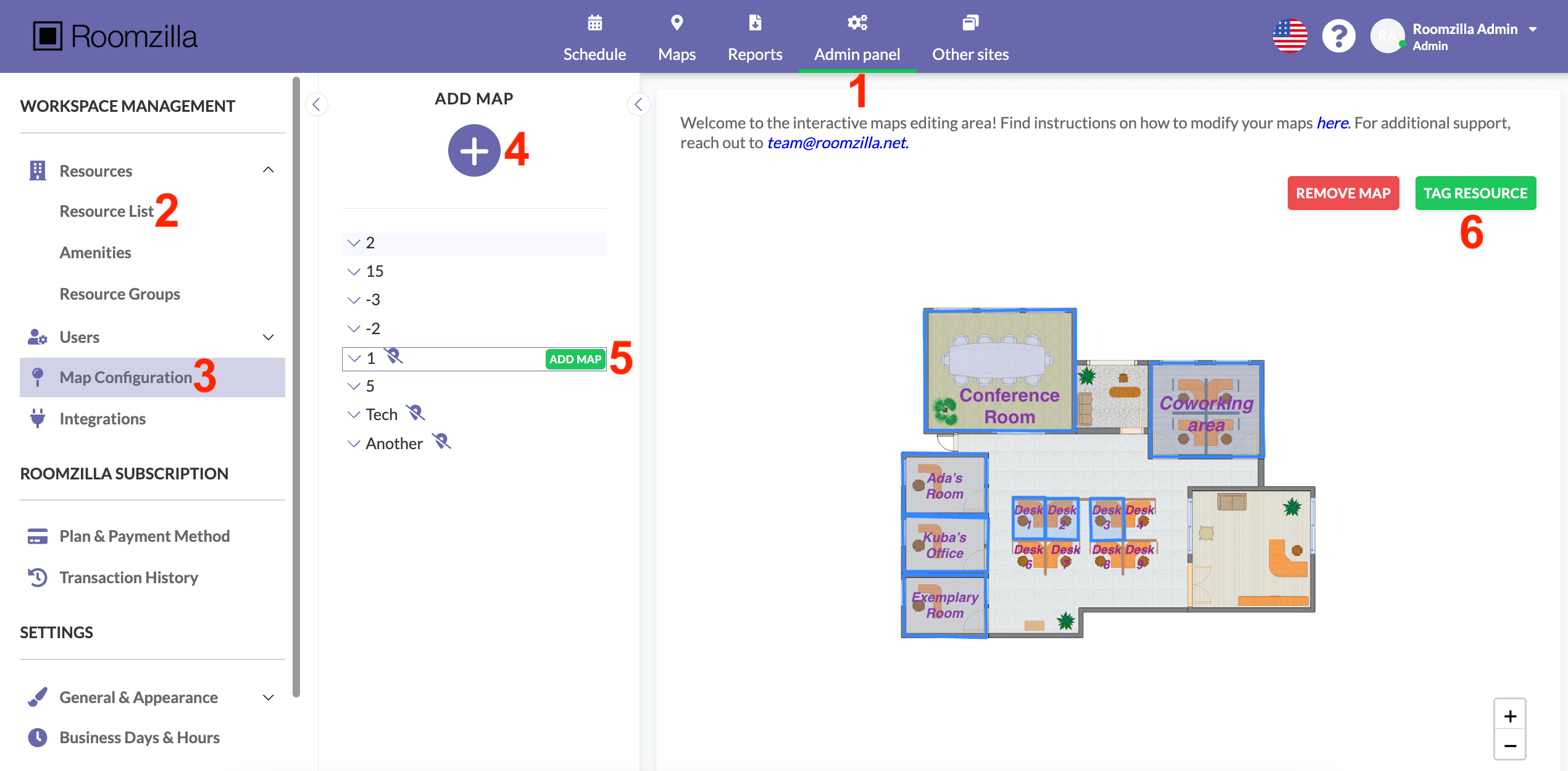 If you need to tag any new resources on the existing map, navigate to Admin panel [1] > Map Configuration section [3]. Select the appropriate map by clicking on it in the floor list, and follow the instructions provided in step 4 above.